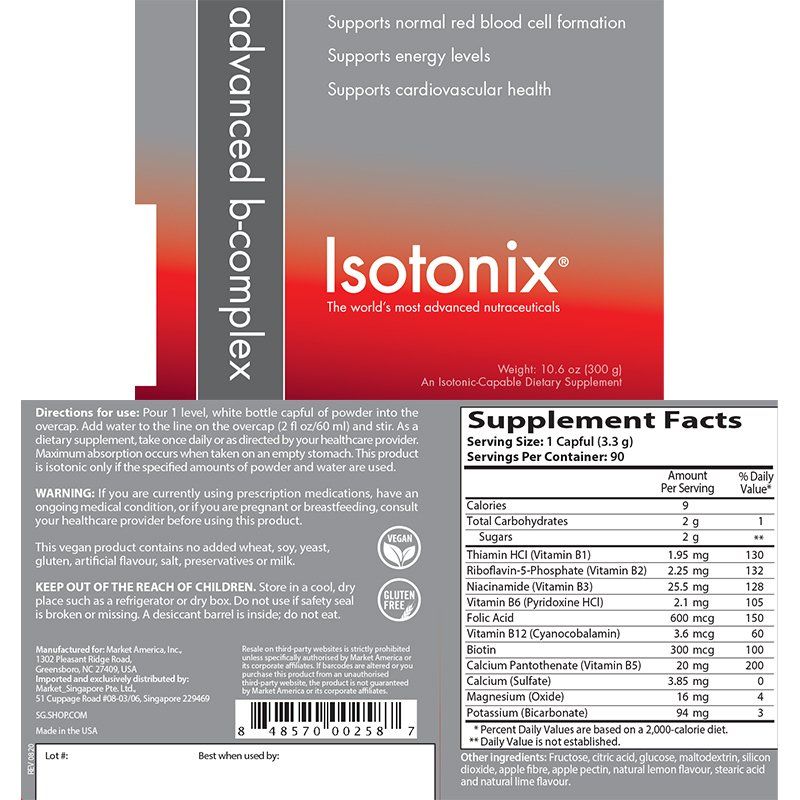 Isotonix Advanced B-Complex is an isotonic-capable combination of the essential B vitamins with magnesium and potassium to support health. Isotonix Advanced B-Complex provides the vitamins B-12, B2 (riboflavin), B6, folic acid, vitamins B3 (niacin), B5, B1 and biotin. Isotonix Advanced B-Complex works by supporting red blood cell formation, energy levels and cardiovascular health.