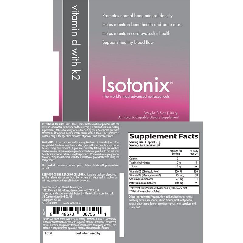 Isotonix Vitamin D with K2 contains vitamin D3, the metabolically active form of vitamin D, along with vitamin K2, a form of vitamin K which suppor ts cardiovascular health. Vitamin D plays an important role in bone health and immune health while working with vitamin K to support the absorption of calcium. Isotonix Vitamin D with K2 is to deliver both these great vitamins with isotonic delivery.